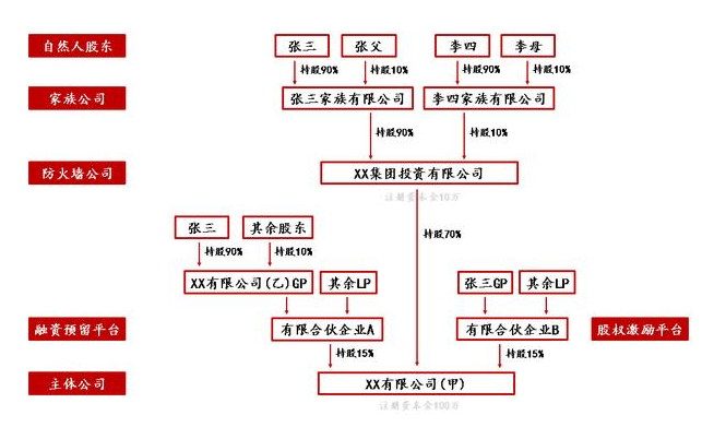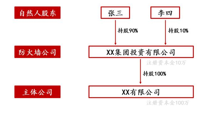 防火牆公司一(yī)般也是注冊為(wèi)有(yǒu)限責任公司,它的(de)作用主要有(yǒu)兩個:第一(yī),防火牆公司作為(wèi)法人,可(kě)以将自(zì)然人股東與主體公司隔離(lí),從而降低(dī)了自(zì)然人股東的(de)風險;第二,未來等企業逐步壯大後可(kě)以作為(wèi)投資平台來使用。這裏注意,防火牆公司是不參與主體公司做(zuò)具體實操業務的(de),僅作為(wèi)投資公司使用。在防火牆公司裏,創始人可(kě)以作為(wèi)法人,因為(wèi)站在投資公司的(de)屬性上來說,防火牆公司的(de)風險很低(dī)且可(kě)控。具體股權架構修正如(rú)下: